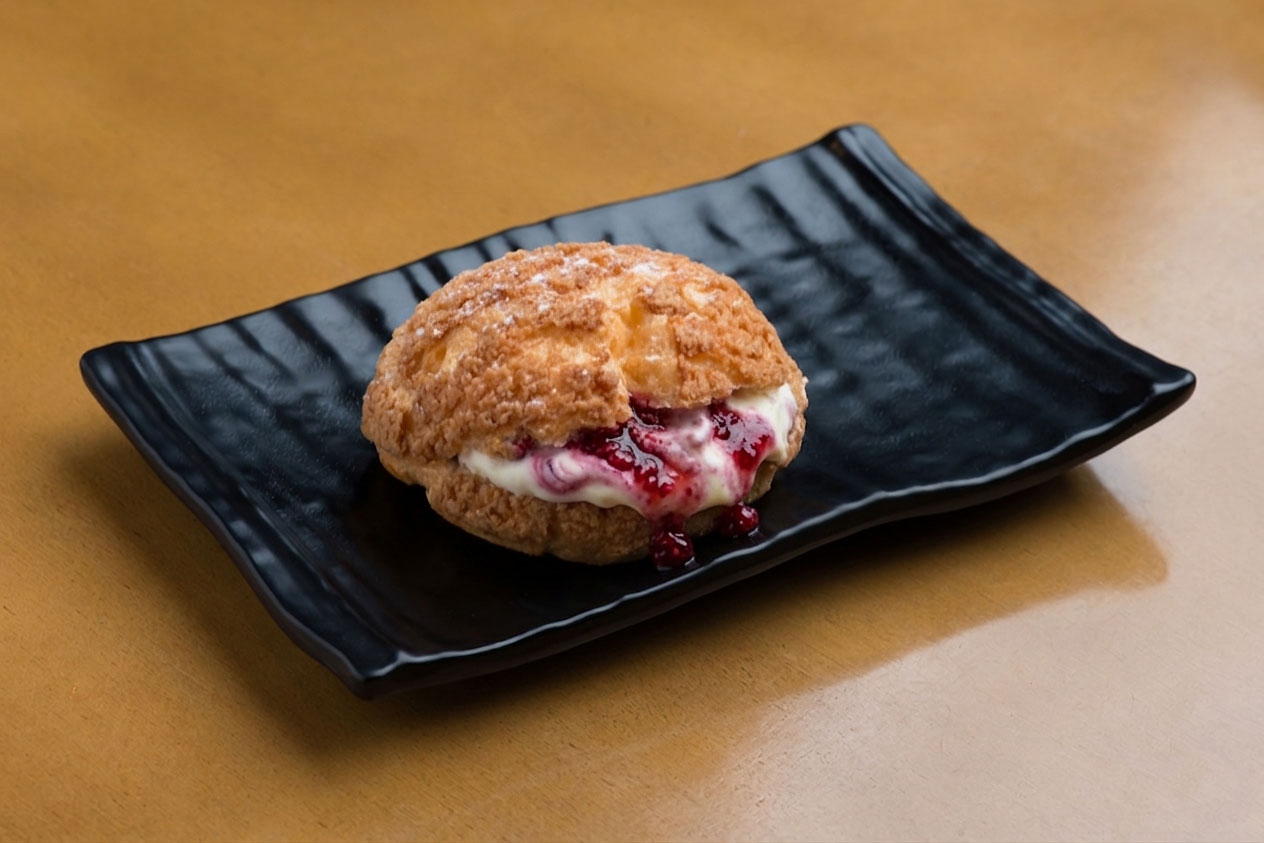 Massa leve e crocante com recheio de baunilha e geléia de frutas vermelhas.