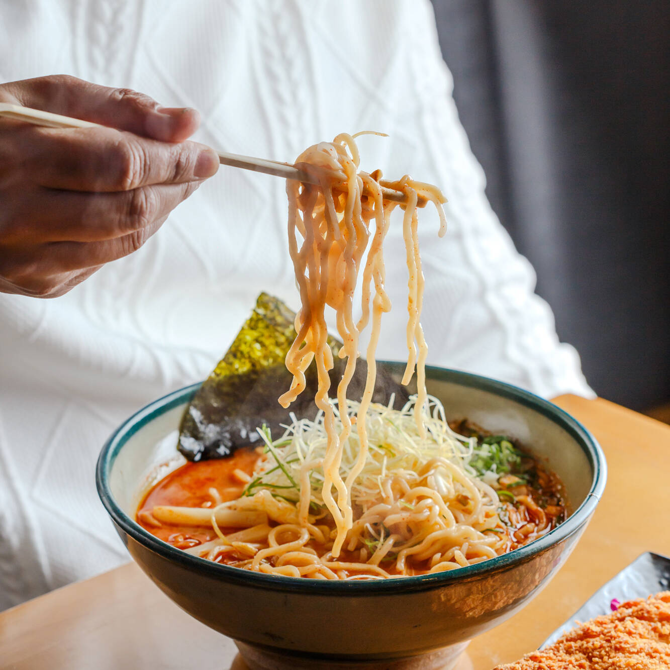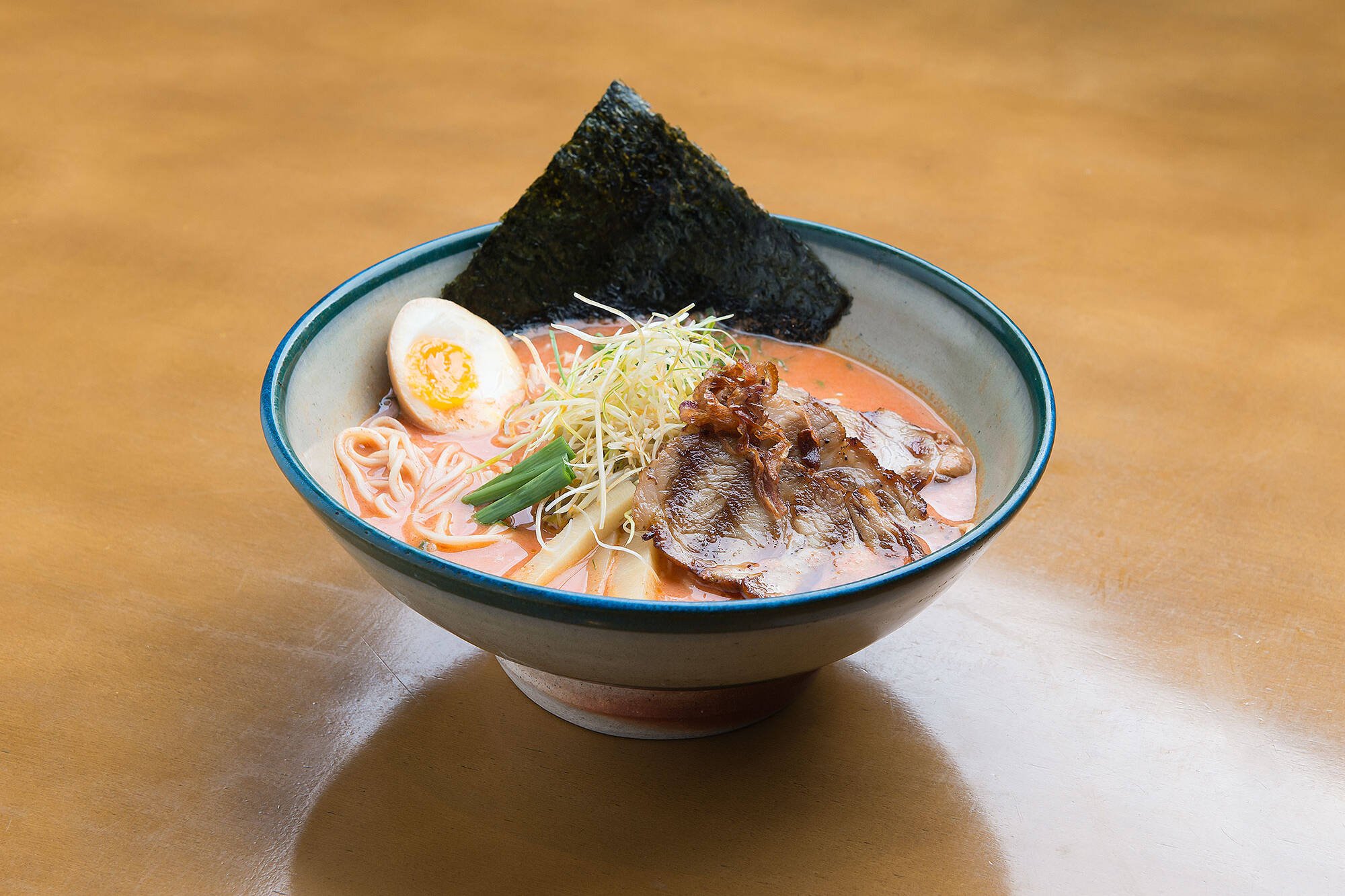 Macarrão médio cacheado, chicken katsu, menma, nirá, cebolinha, repolho, folha de nori, moyashi, alho poró, hanjuko tamago (ovo), caldo à base de pasta de soja apimentado.
