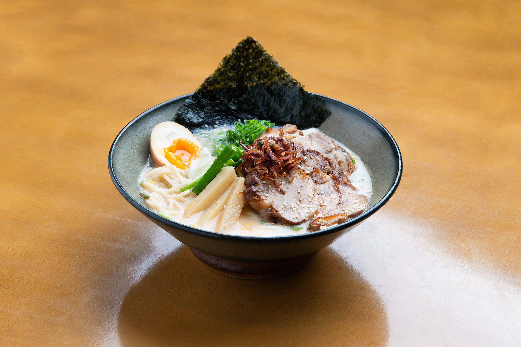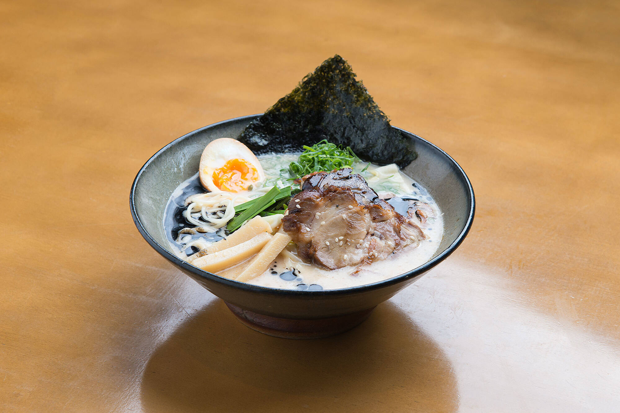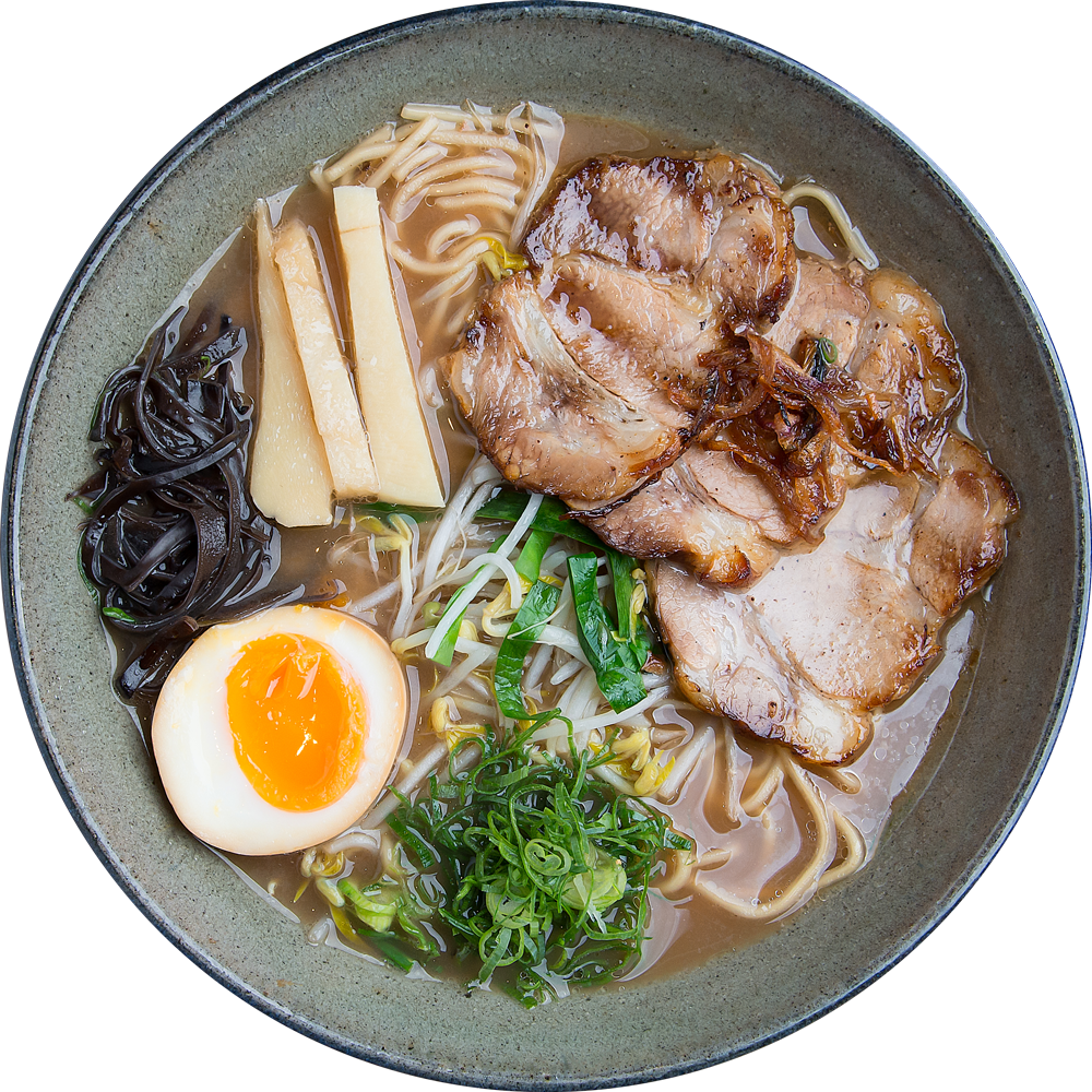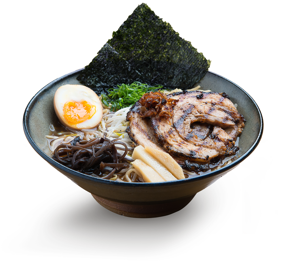 Macarrão médio cacheado, chashu (copa lombo ou panceta), menma, cebolinha, nirá, repolho, folha de nori, moyashi, hanjuko tamago (ovo), caldo à base de pasta de soja. Só panceta + R$4