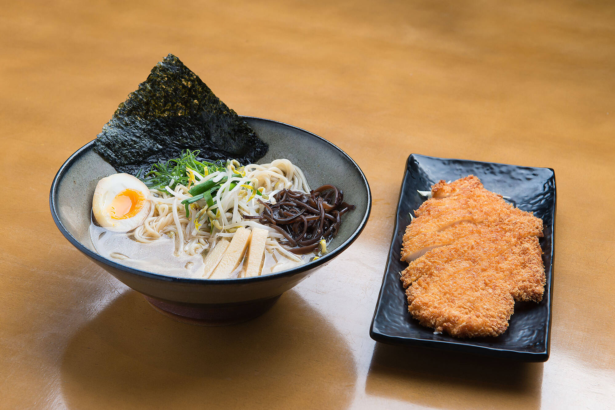Macarrão fino, chicken katsu, menma, cebolinha, nirá, folha de nori, moyashi, kikurage (cogumelo), hanjuko tamago (ovo), caldo a base de shoyu.