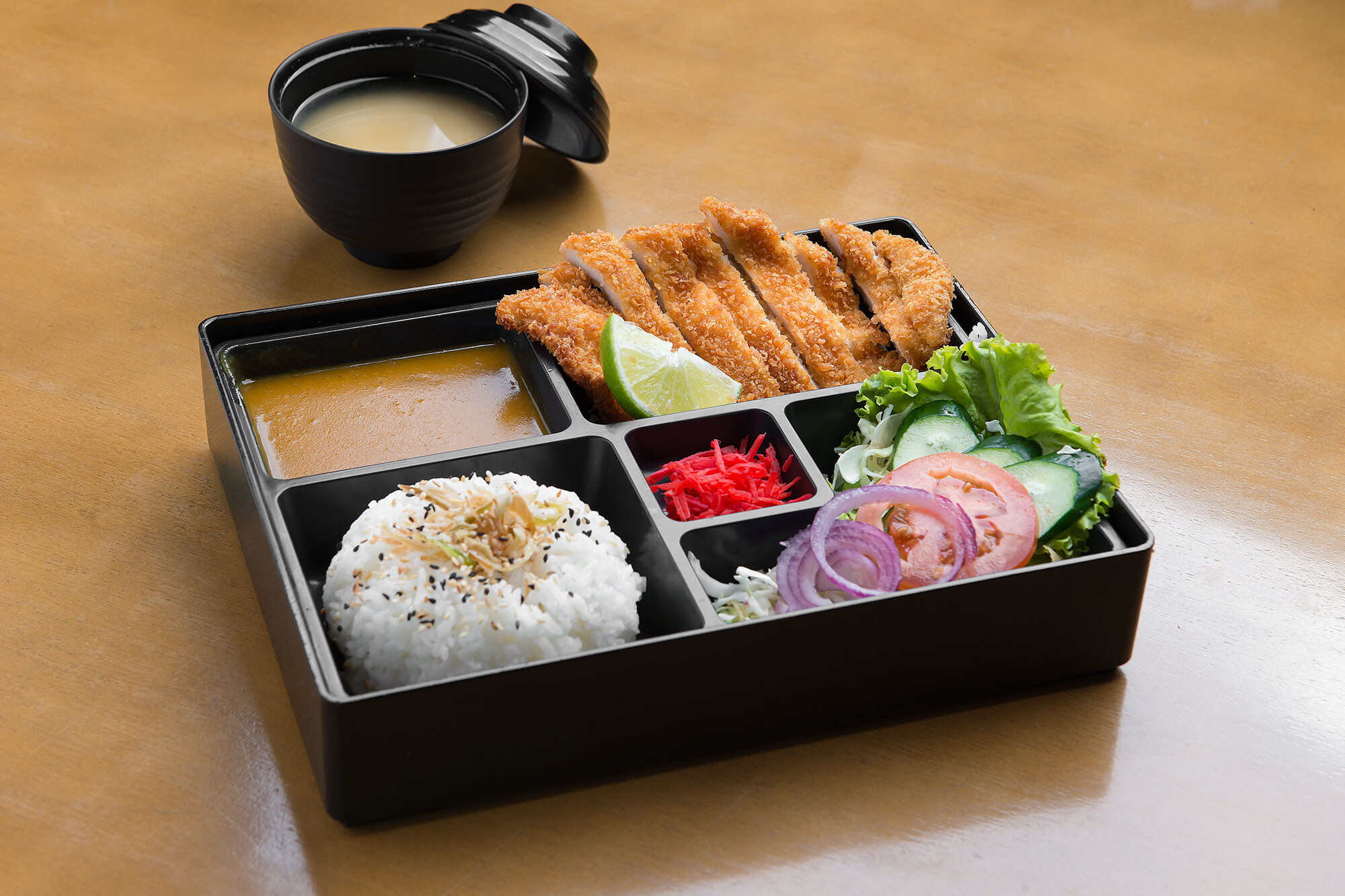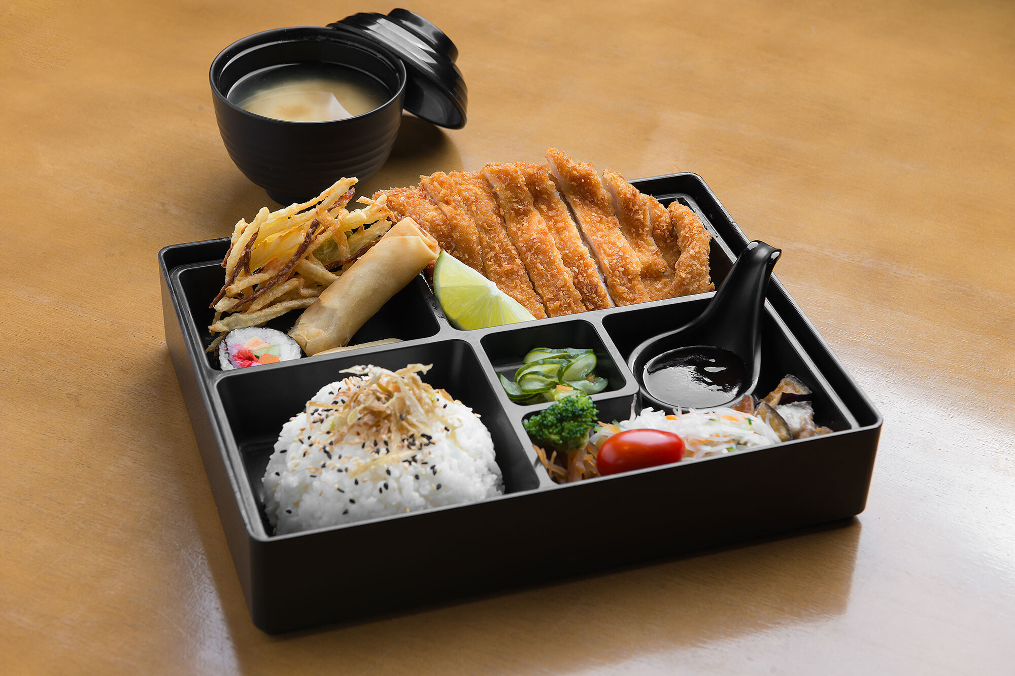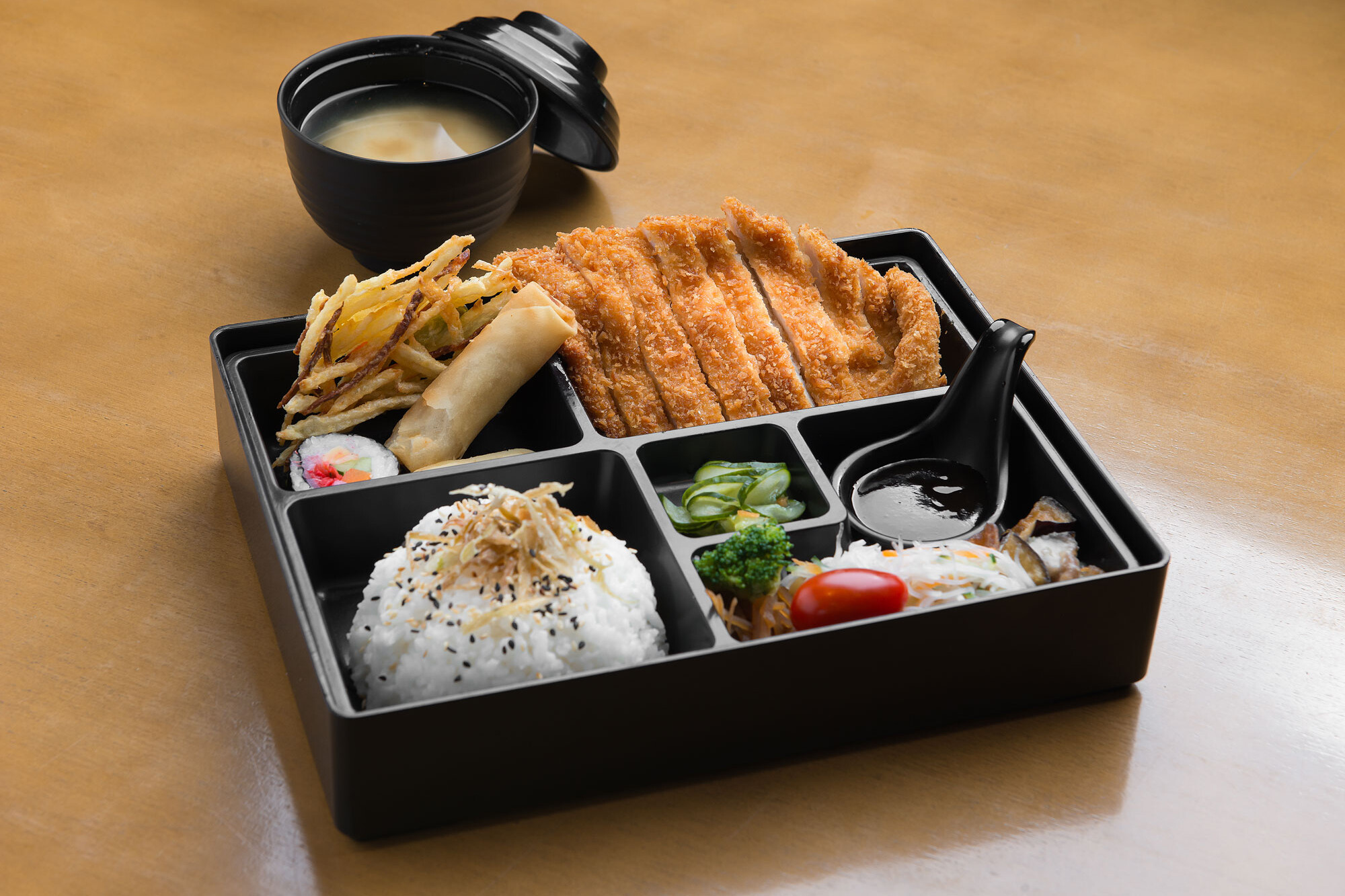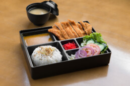 Filé de lombo de porco empanado. Acompanhamentos: gohan, tempurá de legumes, harumaki, tamago, futomaki, alho poró crispy, sunomono, brócolis, tomate cereja, beringela ao missô, gobô e sopa de missoshiro.