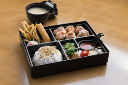 Filé de frango empanado. Acompanhamentos: gohan, tempurá de legumes, harumaki, tamago, futomaki, alho poró crispy, sunomono, brócolis, tomate cereja, beringela ao missô, gobô e sopa de missoshiro.