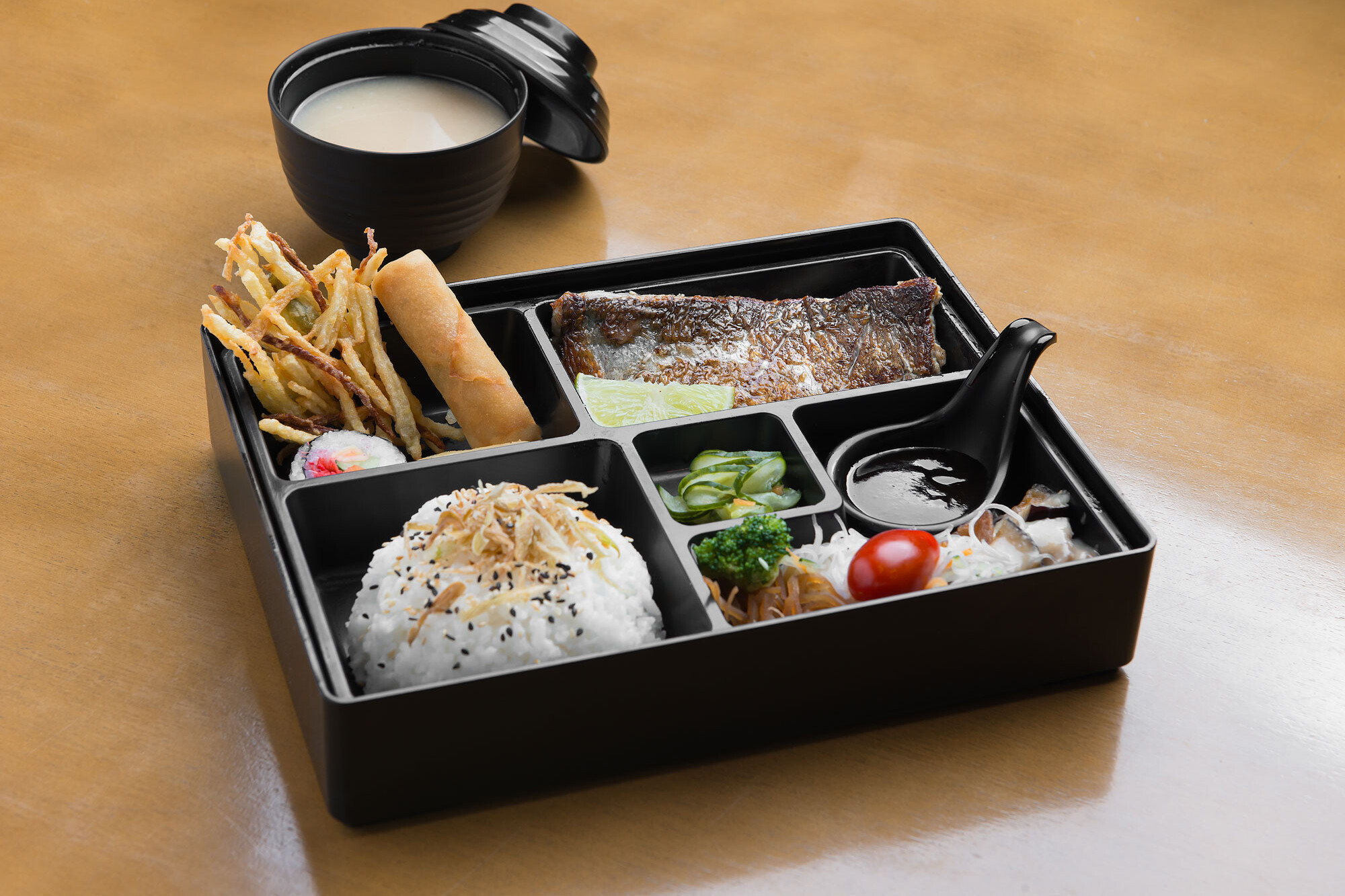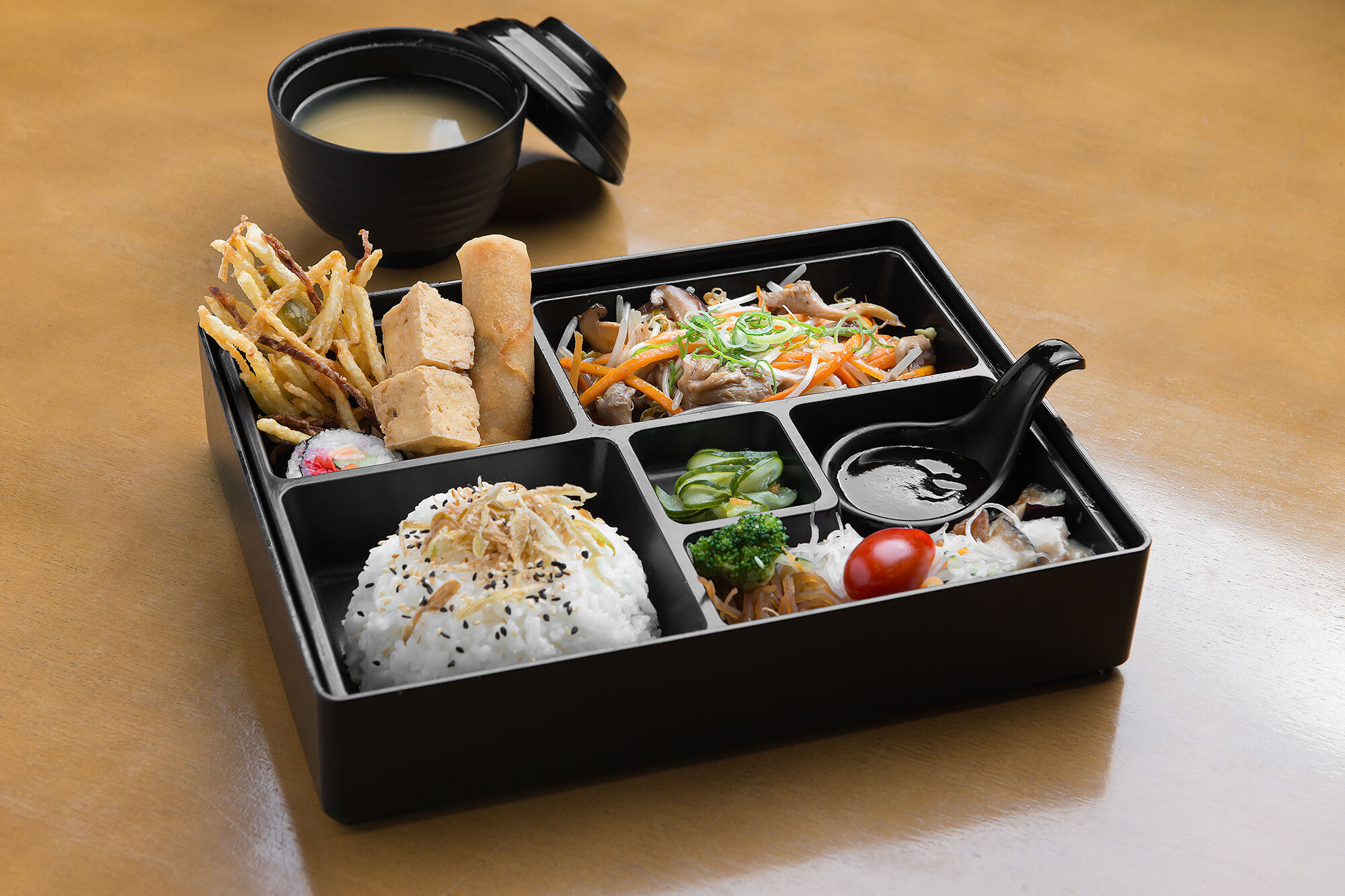 Filé mignon bovino empanado. Acompanhamentos: gohan, tempurá de legumes, harumaki, tamago, futomaki, alho poró crispy, sunomono, brócolis, tomate cereja, beringela ao missô, gobô e sopa de missoshiro.