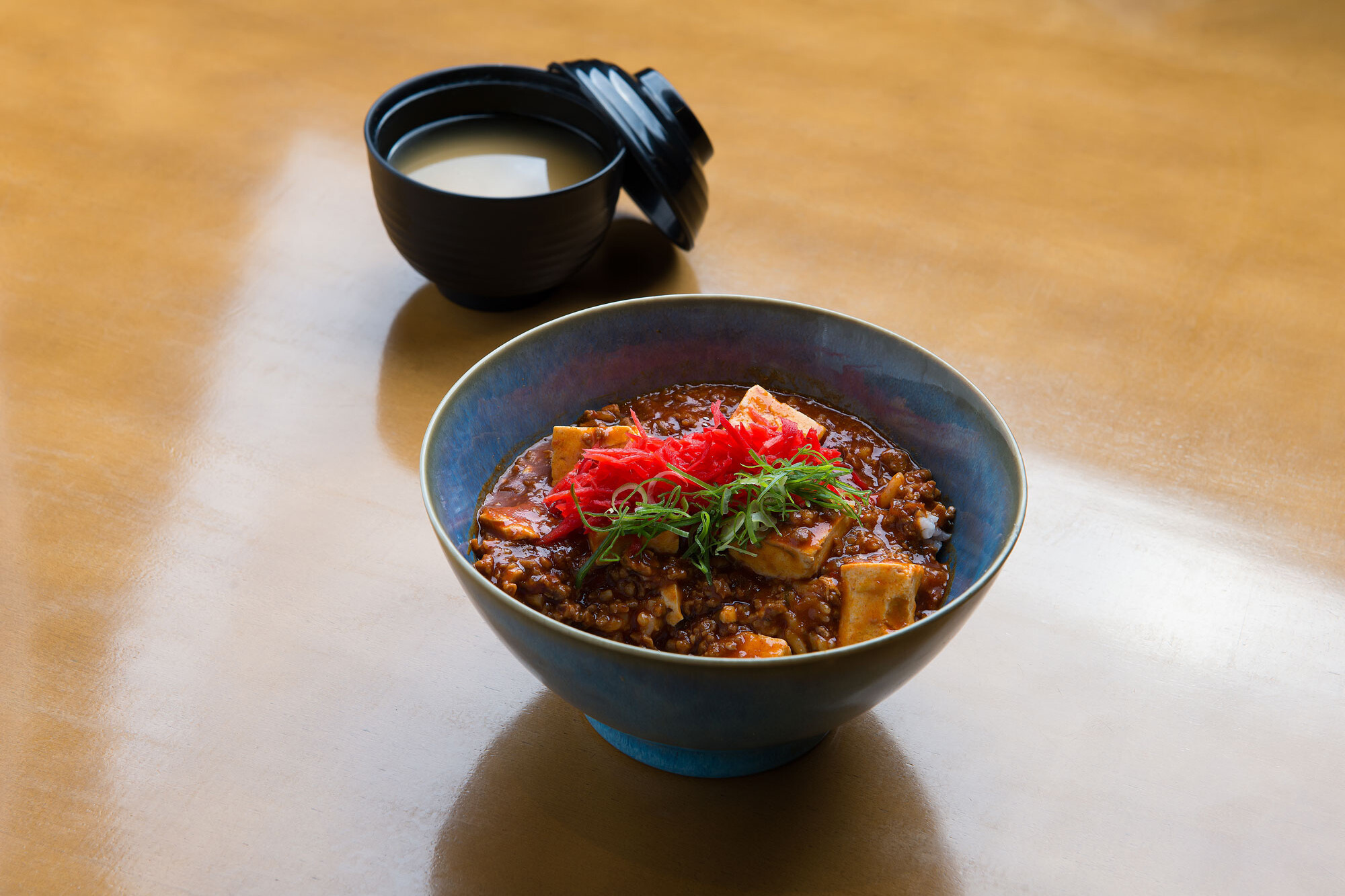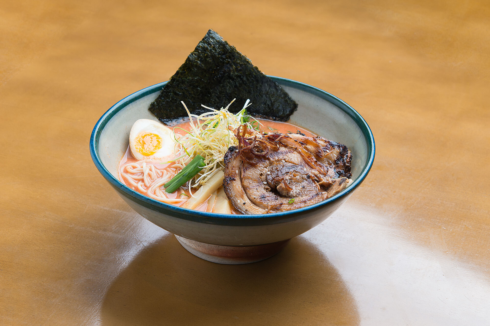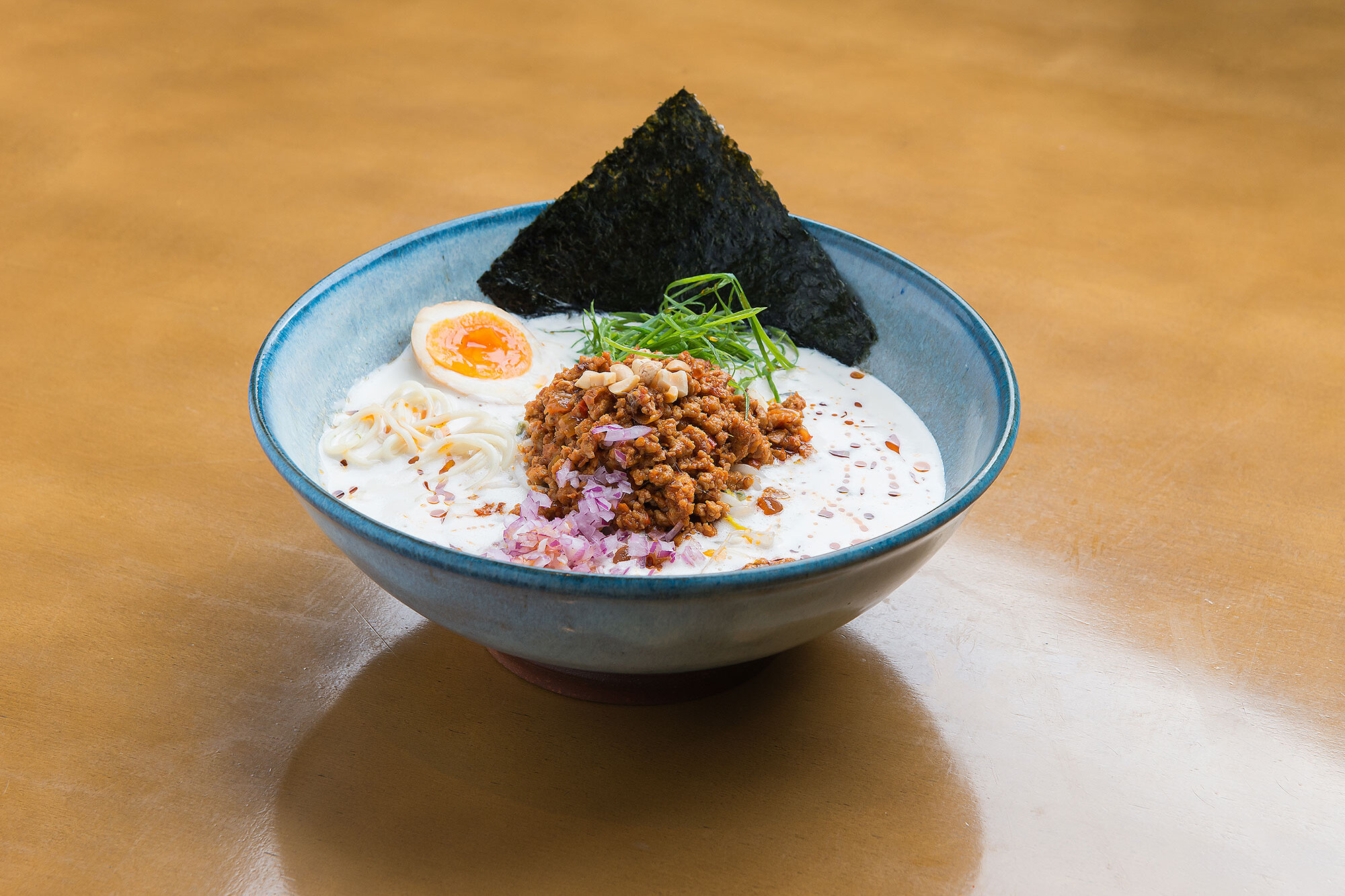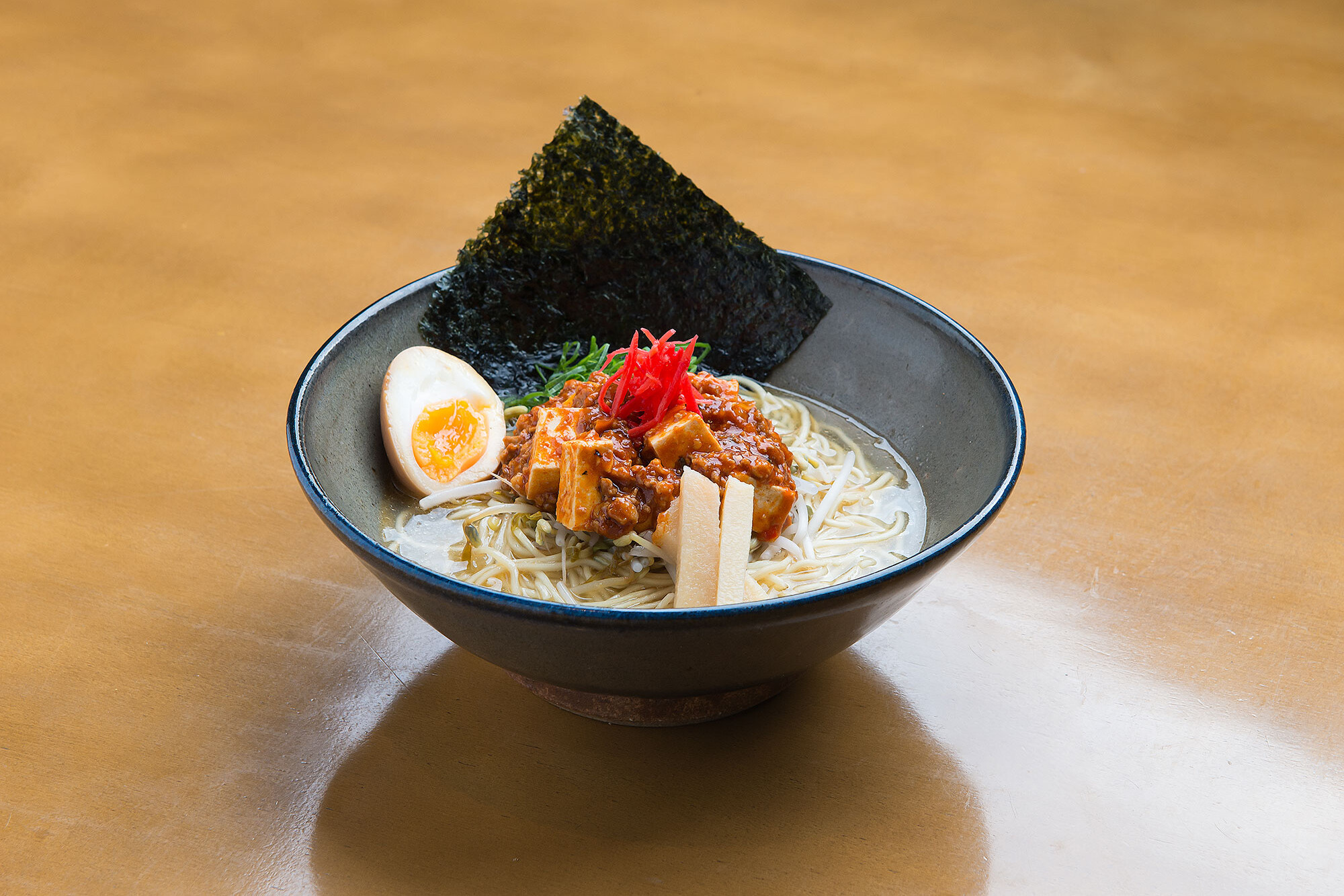Macarrão médio fino, tofu, carne moída de porco picante, cebolinha, cebola roxa, moyashi , nori, hanjuko tamago, caldo a base de sal.