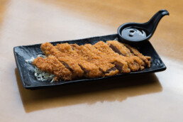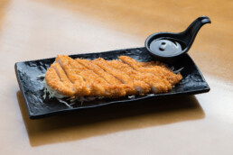 Filé de lombo de porco empanado, super crocante e com tempero da casa. Acompanha molho teriyaki.