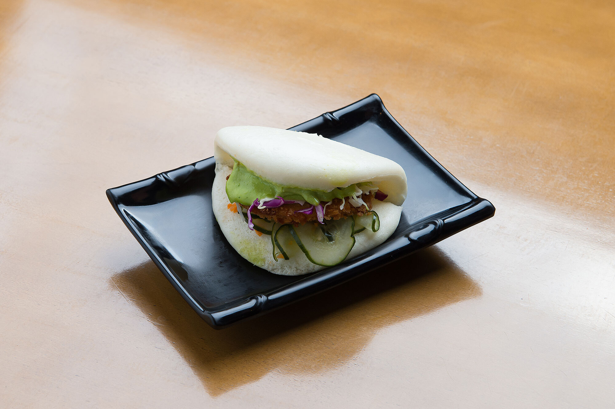 Pão chinês super macio recheado com filé de frango empanado, sunomono, salada de repolho e maionese verde da casa.