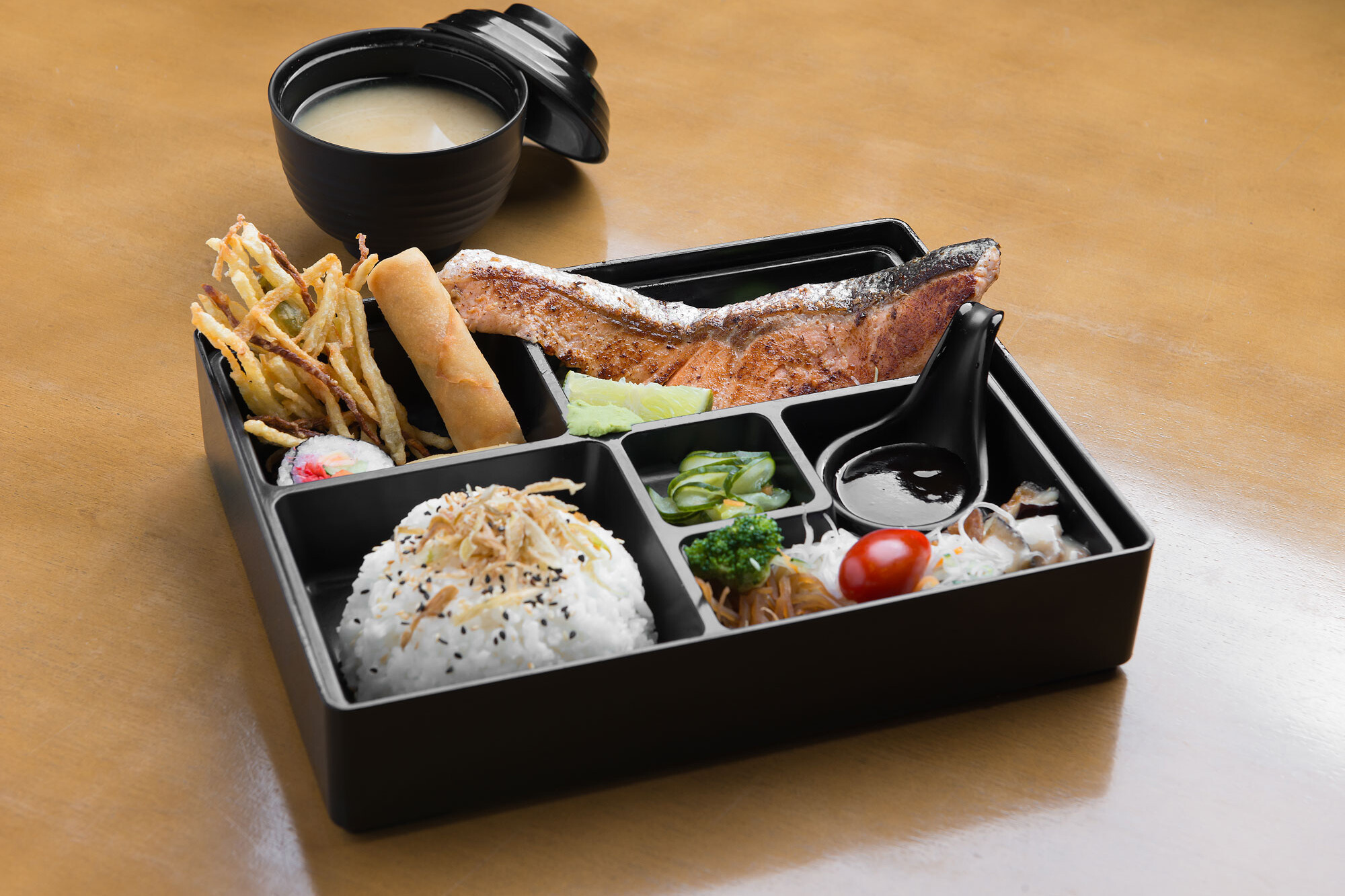 Filé de salmão grelhado. Acompanhamentos: gohan, tempurá de legumes, harumaki, tamago, futomaki, alho poró crispy, sunomono, brócolis, tomate cereja, beringela ao missô, gobô e sopa de missoshiro.