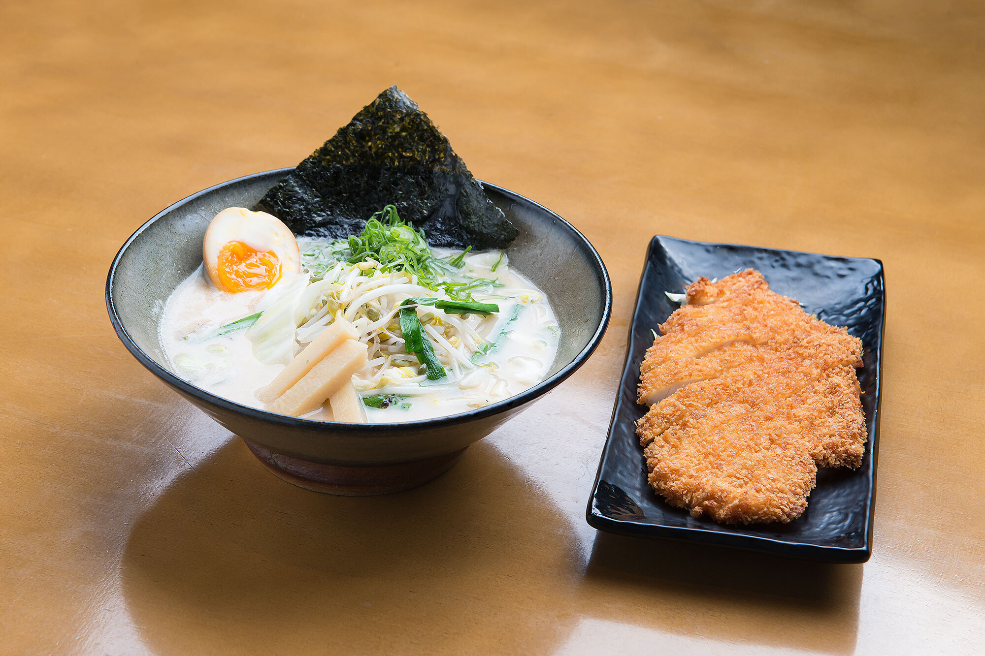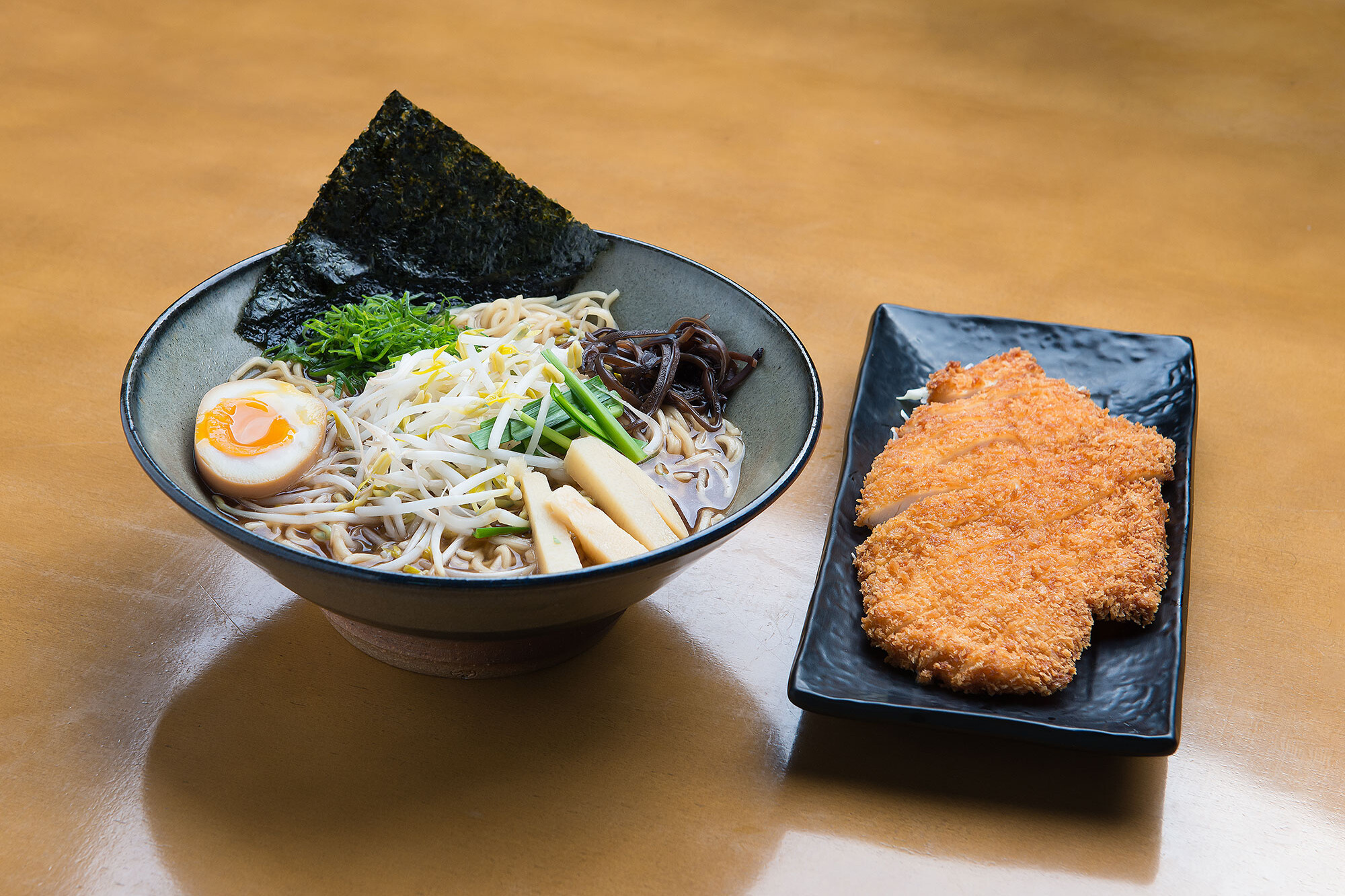 Macarrão fino, chicken katsu, menma, cebolinha, nirá, folha de nori, moyashi, kikurage (cogumelo), hanjuko tamago (ovo), caldo à base de frango e shoyu.