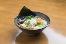Macarrão fino, shitake, tofu, cebolinha, nirá, folha de nori, moyashi, cenoura, caldo à base de legumes e pasta de soja.