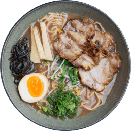 Macarrão fino, chashu (copa lombo ou panceta), menma, cebolinha, nirá, folha de nori, moyashi, kikurage (cogumelo), hanjuko tamago (ovo), caldo à base de sal. Panceta + R$4