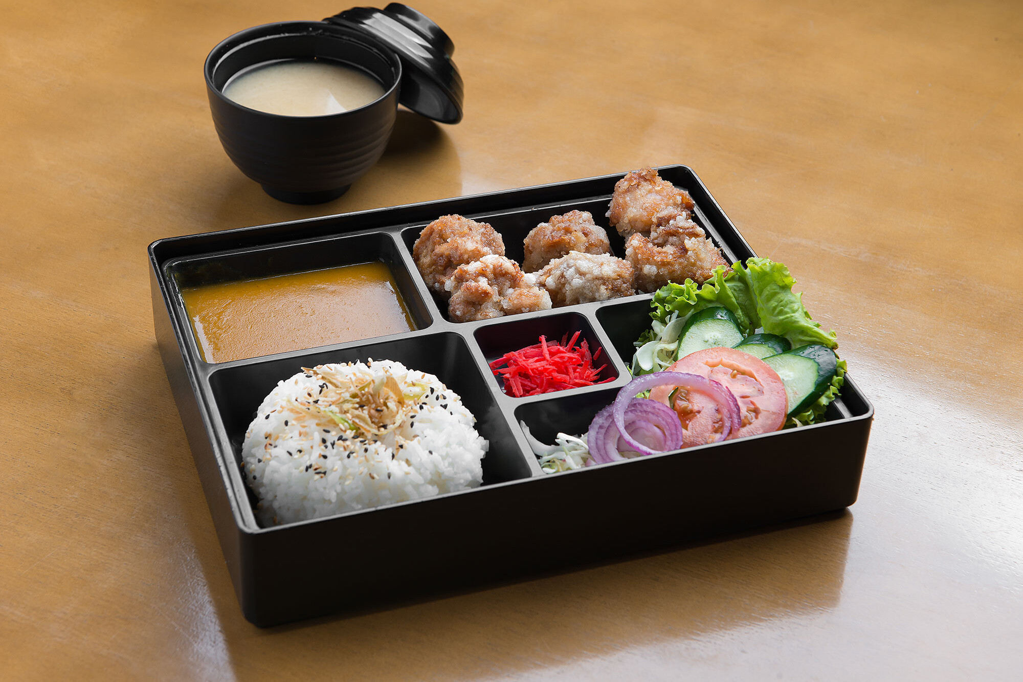 Karê japonês picante com copa lombo empanado. Acompanhamentos: gohan, alho poró crispy, gengibre, mix de salada de alface, pepino japonês, repolho, tomate, cebola com molho de shoyu cítrico e sopa de missoshiro.