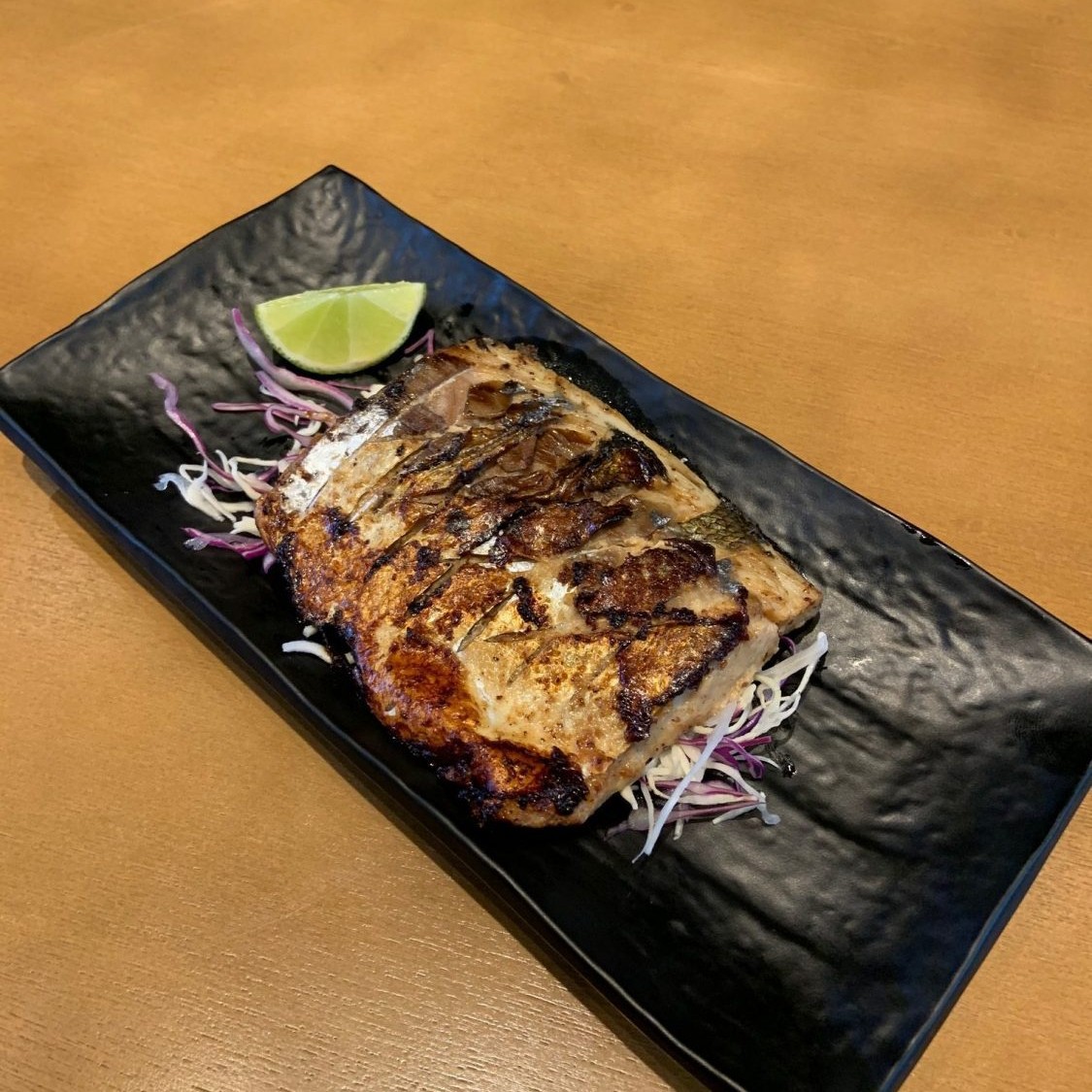 Filé de anchova grelhada. Acompanhamentos: gohan, tempurá de legumes, guioza de carne de porco, tamago (ovo), futomaki (sushi), alho poró crispy, sunomono (salada de pepino japonês), brócolis, tomate cereja, beringela ao molho missô, gobô (bardana) e sopa de missoshiro.