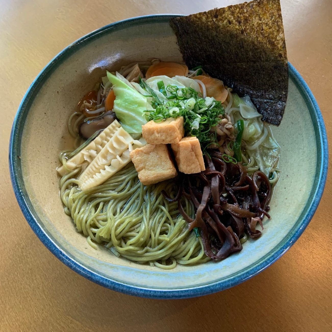 Macarrão fino de espinafre, shimeji, tofu, menma, cebolinha, nirá, repolho, folha de nori, moyashi, cenoura, kombu, caldo à base de legumes.