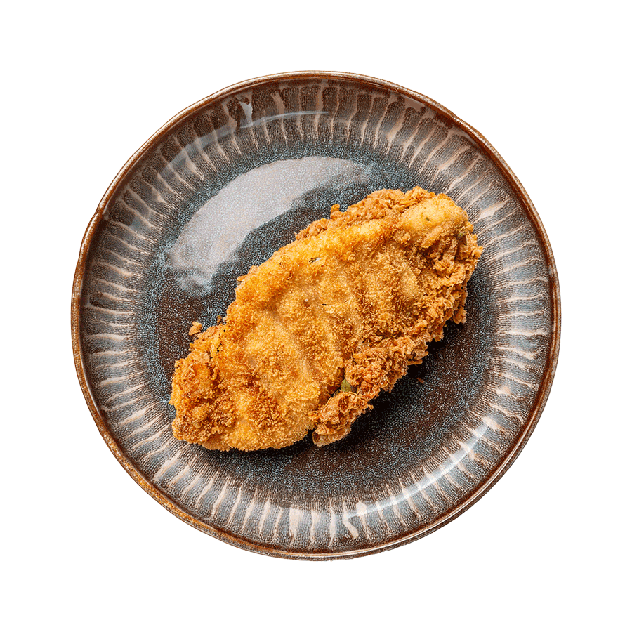 Filé de frango empanado com farinha de rosca especial. Acompanhamentos: gohan, tempurá de legumes, guioza de carne de porco, tamago (ovo), futomaki (sushi), alho poró crispy, sunomono (salada de pepino japonês), brócolis, tomate cereja, beringela ao molho missô, gobô (bardana) e sopa de missoshiro.