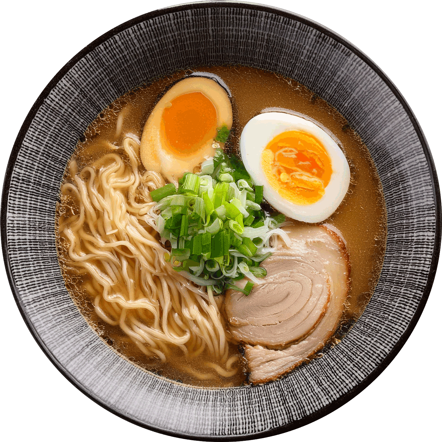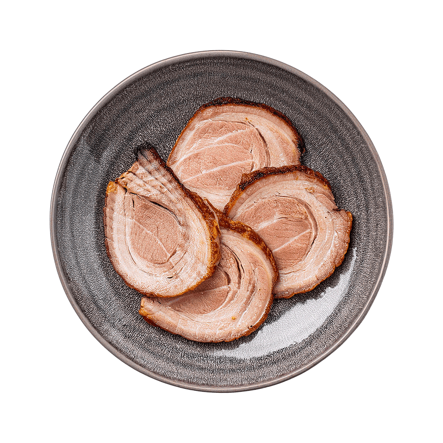 Macarrão fino, chashu (copa lombo ou panceta), menma, cebolinha, nirá, folha de nori, moyashi, kikurage (cogumelo), hanjuko tamago (ovo), caldo à base de shoyu.